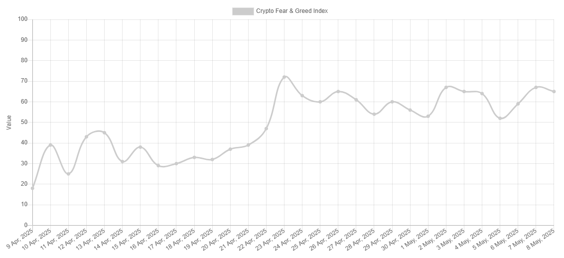According to alternative.me, the Crypto Fear & Greed Index stood at 24 (flagging the sentiment to be that of Fear) on April 8 and by May 8, it rose to 65 (indicating market Greed). This upward shift highlights increasing optimism and risk-on sentiment, in line with ETF flows and improving technical strengths.