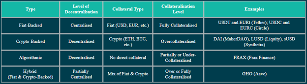 Figure 1 provides an illustrative overview of the different types of stablecoins based on their reserve backing structure, level of decentralisation and peg mechanism.
