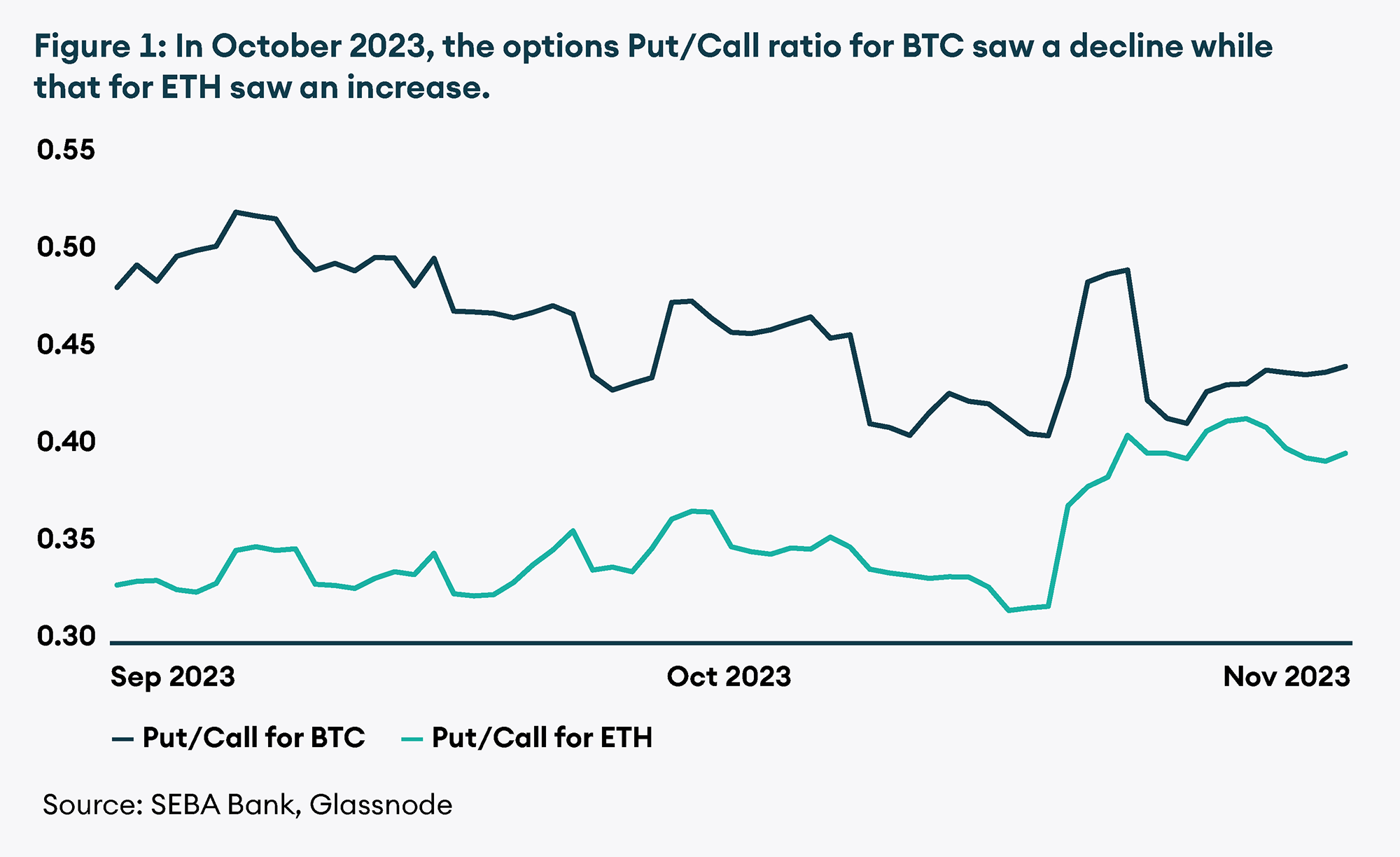 Amidst the buzz of ETF prospects, the open interest in CME Bitcoin futures surpassed 100K BTC for the first time on 24 October. The market share of CME Bitcoin derivative contracts concurrently reached an all-time high of 25%, rapidly approaching the 29% market share held by Binance. As open interest expanded, the 1-month annualised futures premium for BTC surged to 13%, notably higher than that of Ethereum (ETH). This upswing suggests the potential entry of traditional financial players into the Bitcoin market, possibly in anticipation of an imminent Bitcoin ETF approval. According to Glassnode data, the open interest-weighted mean Bitcoin futures perpetual funding rate across exchanges stands at 0.012% with traders paying the rate to hold their long positions on BTC. The 30-day average total futures open interest for BTC increased by over 44.9% in the month of October to reach USD 25.36 billion at the time of writing, while total options open interest is at USD 12.23 billion. The put/call ratio decreased from 0.48 to 0.43, indicating a significant shift in sentiment towards the positive side.