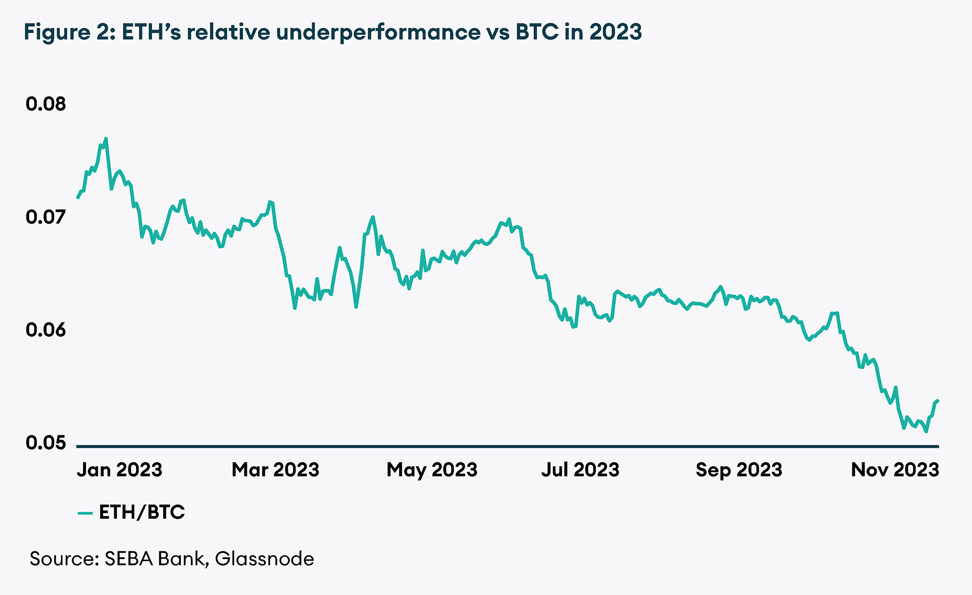 Reflecting on Ethereum’s performance in 2023, one may wonder why it significantly underperformed Bitcoin (BTC) this year. For context, Ethereum’s year-to-date returns are just over 58%, whereas Bitcoin’s have reached 110% at the time of this writing. The ETH/BTC ratio has declined by roughly 30% year-to-date. While this performance differential lacks a definitive explanation, several factors may have played a role.