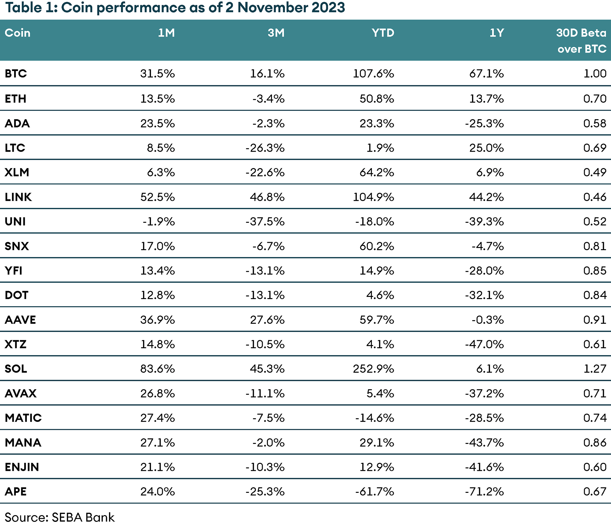 The month of October lived up to expectations, maintaining its “Up-tober” reputation. The total cryptocurrency market capitalisation increased over the month, ending 23% higher. In the ever-evolving landscape of cryptocurrencies, recent developments have sparked both enthusiasm and curiosity among investors and enthusiasts. Bitcoin’s notable price surge, briefly surpassing the USD 35K mark, has reignited discussions, primarily fueled by speculations about the potential approval of a Bitcoin exchange-traded fund (ETF). Meanwhile, in addition to ETF rumours, Ethereum’s eagerly anticipated upgrade, Dencun, promises to reshape its ecosystem by improving scalability.