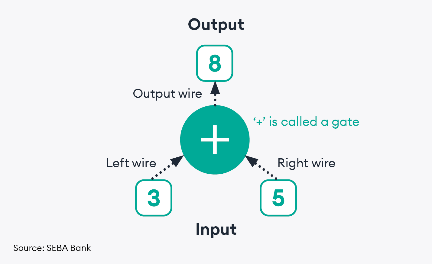 Arithmetization is like building a simple calculator with wires and components to perform basic math operations. Instead of using regular numbers, we represent them with electrical signals. For example, if we have the addition problem “3+5=8,” we can model this as: