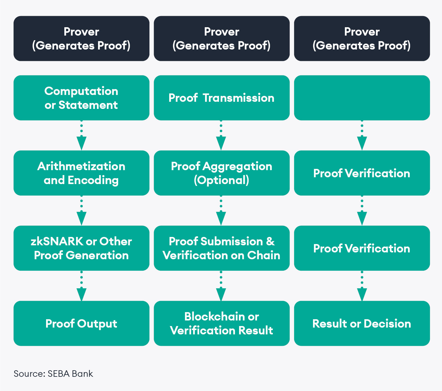 Crypto is hard, explaining it is harder! But I try to keep make things simple just like a lazy person! Below, I have tried to give a simple yet detailed schematic representation of how the different components works together to enable the generation, transmission, and verification of the cryptographic proof system.