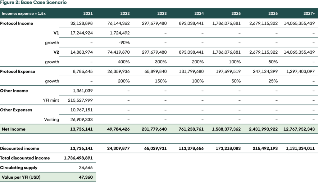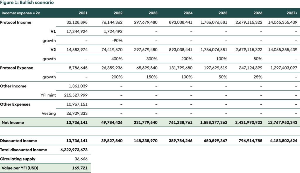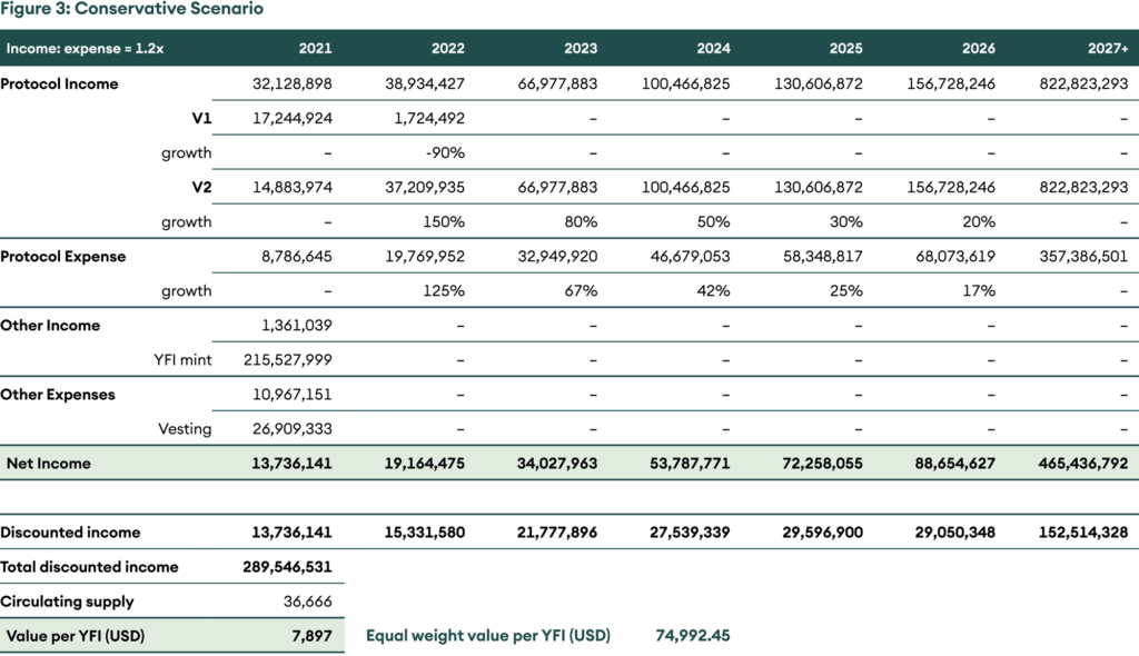 Using a discounting rate of 25%, terminal growth rate of 5%, and giving equal weight to all three scenarios, we arrive at a fair value of USD ~75,000 per YFI.